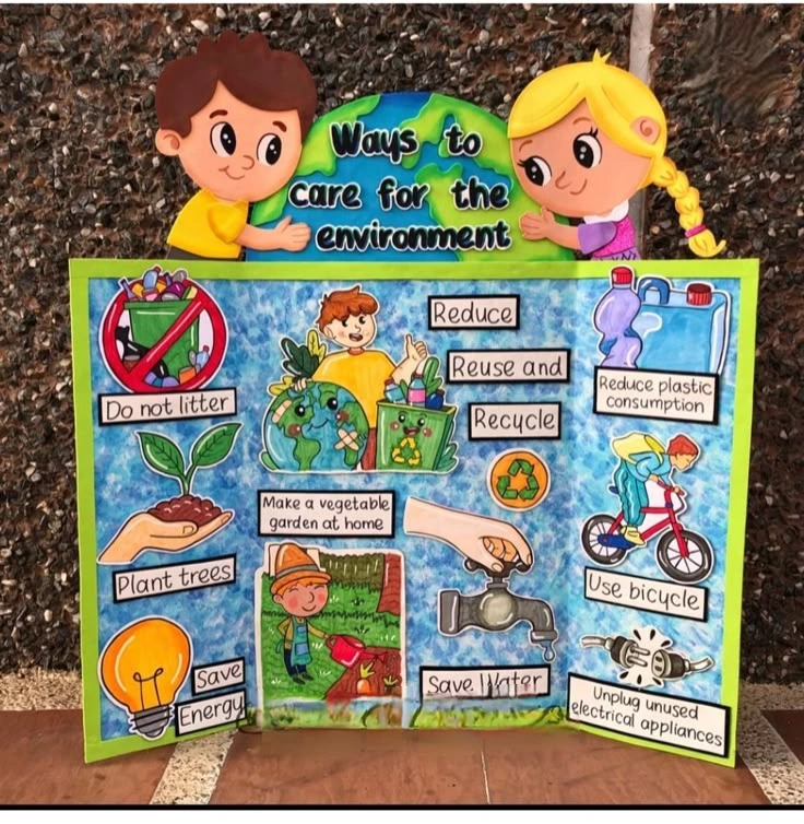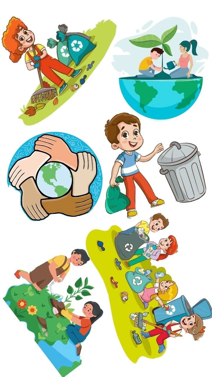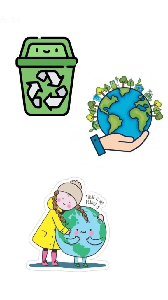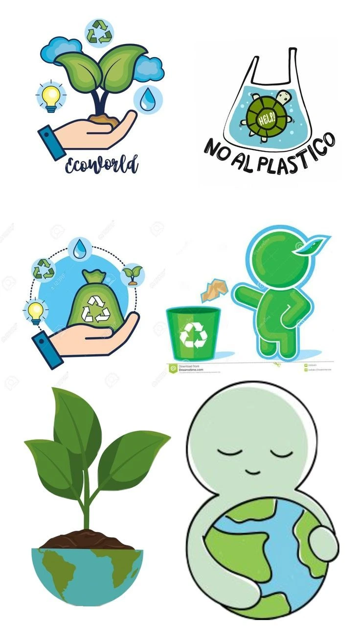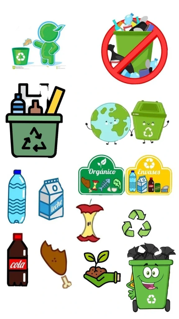 Los dibujos ayudan a que los alumnos se conecten con el tema de manera lúdica. Pueden ser contenedores de reciclaje, materiales reutilizables o personajes simpáticos relacionados con el cuidado del ambiente. Se pueden imprimir en hojas A4, pintar y recortar para decorar la cartelera.