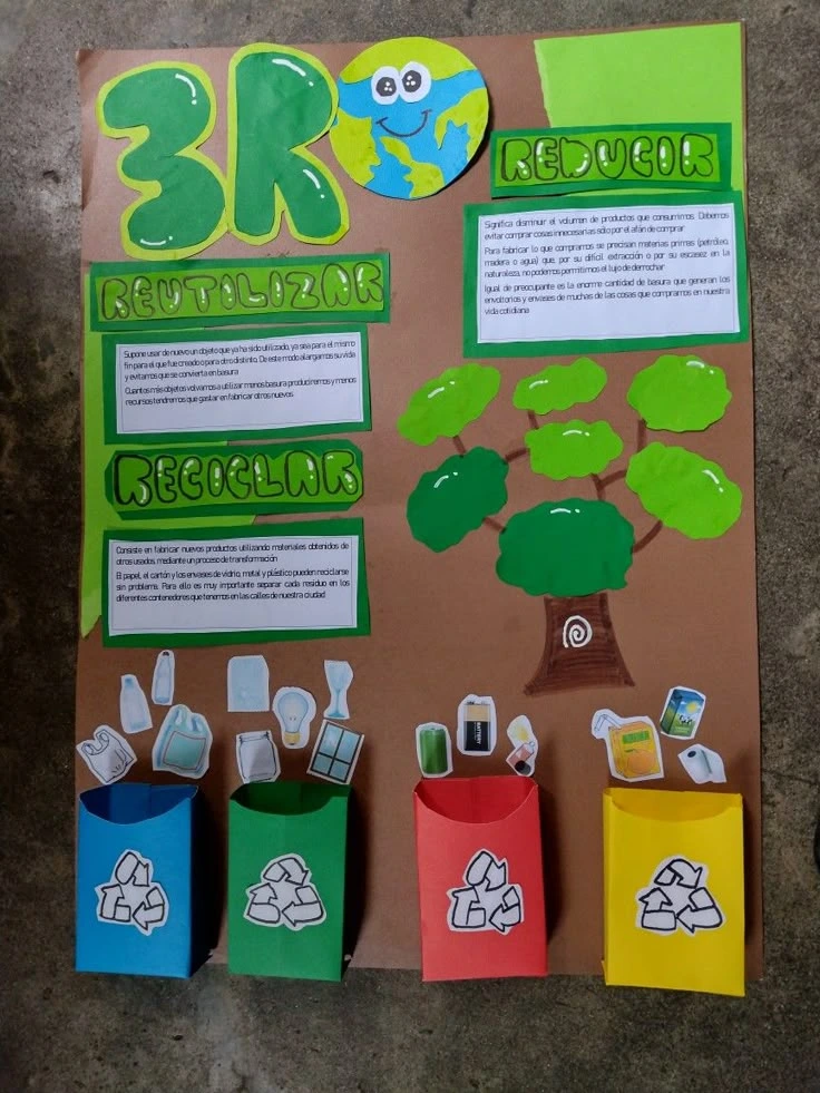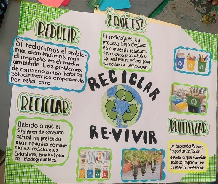 La cartelera del aula o del pasillo puede transformarse en un espacio lleno de ideas sobre reciclaje. Usá cartulinas de colores, escribí títulos grandes como “Reciclar es cuidar el planeta” y sumá afiches informativos con dibujos o frases hechas por los chicos. Lo importante es que sea vistosa y que todos participen en su armado.