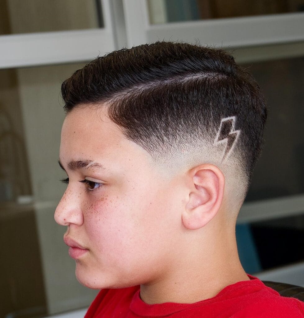 Para los niños de mayor edad, los estilos se vuelven más sofisticados y detallados. Los barberos han empleado técnicas como el degradado para añadir profundidad y dinamismo al diseño, combinando secciones de cabello largo en la parte superior con laterales rapados y rayos que se adaptan a las formas naturales del cabello.