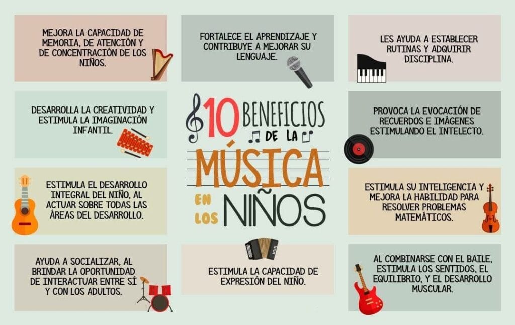 - Desarrollo cognitivo: La música estimula el cerebro y mejora habilidades como la memoria y la atención.