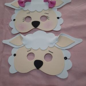 Recorta dos orejas en forma de hoja de oveja en goma eva blanca y una mas pequeñas en color piel para la parte interior de las ovenas, corta un semicirculo con ondasa los costados blanco y otro color piel mas pequeño con bordes lisos y la parte inferiro con una onda por donde esta la nariz, y dos circulos que coincidan con los ojos del niño, tambien corta una nuve blanca del ancho que va de ojo a ojos. luego arma todas las partes segun se ve en la imagen, coloca detalle de cejas y ocico q puede ser negro o rosa. Si deseas sostener el antifaz el rostro, pega un palito en la parte inferior o ata una cinta elástica a los lados.