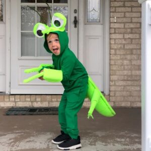 El disfraz de langosta para Halloween consiste en ropa totalmente verde, incluyendo una capucha con dos grandes ojos y antenas aplicados. Lleva dos pinzas tipo guantes para las manos y una cola que completa la apariencia de saltamontes.