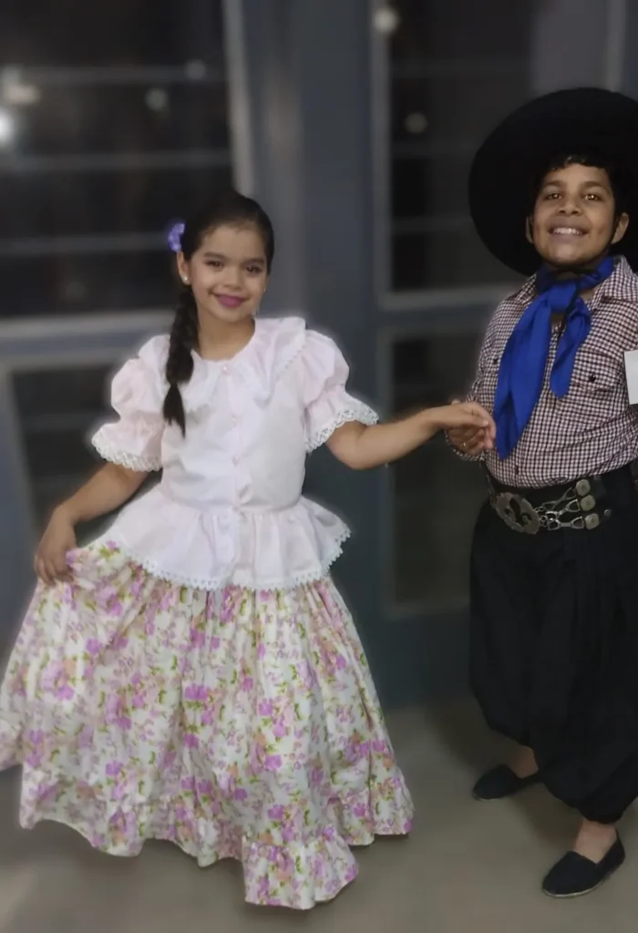 El chamamé es un baile que puede ser tanto alegre como melancólico. Para los niños, una opción simple y económica es un pantalón negro, una camisa blanca y un cinturón ancho. Las niñas pueden usar un vestido suelto y ligero, preferiblemente de colores pastel o con estampados florales. Un pañuelo en el cuello para los niños y una cinta en el cabello para las niñas completan este look sencillo pero tradicional.