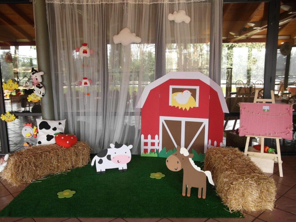 Los niños pueden venir disfrazados de animales de granja como vacas, ovejas, cerdos, o granjeros. La decoración puede incluir cercas de cartón, paja, y figuras de animales. Se pueden organizar actividades como la búsqueda de huevos (de plástico o cartón), un juego de «alimentar al animal» donde los niños lancen «comida» a bocas de animales hechas de cartón, o una carrera de sacos simulando el salto de conejos. También puedes montar una pequeña estación de pintura de máscaras de animales de granja para que los niños se lleven un recuerdo creativo de la fiesta.