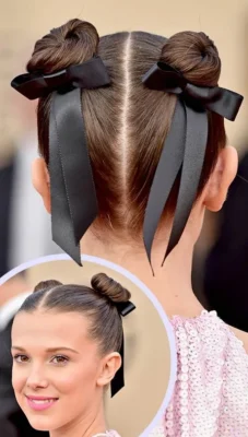 Dos rodetes altos adornados con lazos negros, perfectos para un look moderno y chic. Este peinado combina diversión y elegancia, ideal para cualquier ocasión, desde un día casual hasta eventos especiales. ¡Un estilo adorable y sofisticado!