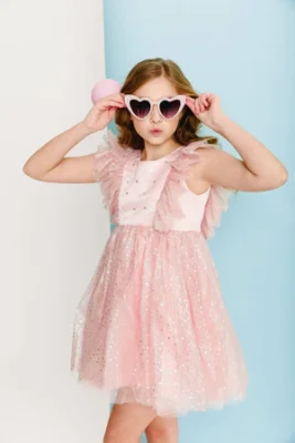 Radiante vestido rosa para niñas, con delicado tul que añade un toque de magia. Adornado con sutiles brillos, este diseño es perfecto para princesitas que desean deslumbrar en cualquier ocasión especial.