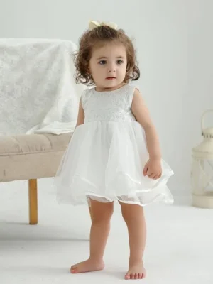 Para eventos especiales, como fiestas o celebraciones, un vestido blanco con detalles suaves, quizás algún lazo o encaje, hará que tu bebé sea el centro de todas las miradas.
